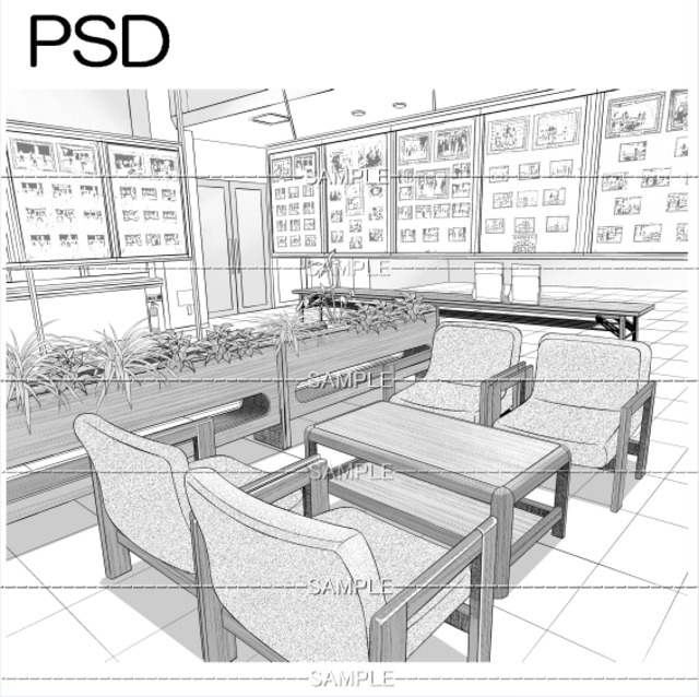 swロビー応接セット02PSD パネルのサンプル画あり 手前の椅子と机はそれぞれ別レイヤーと なっていますので人物が入れやすく なっています 椅子ABCDのフォルダ内は同じです グレー処理フォルダは 濃淡の%で表現しています 60線10%はトーンに置き換える時は スクリントーンの61番にして下さい ドットのトーンに変換は 各レイヤーを選択して 置き換えてください 作画内容は画像の各フォルダー レイヤーから確認できます 公共施設 コミュニティセンター ホテル 旅館 ロビー 応接