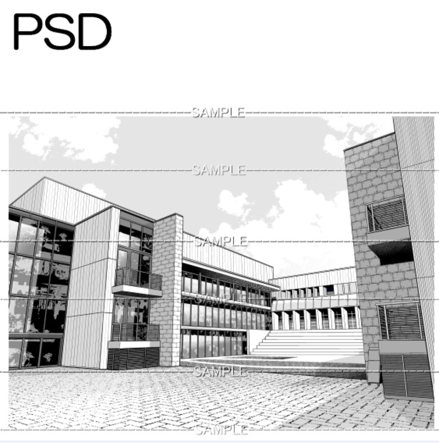 中庭のある建物PNG画像 トーンベタ処理入り トーン無し 線画のみタイル 有り無しの4枚 画像内容はサンプル画面で 確認してください 原稿サイズ 5500×4030pixel 600dpi 公共施設 学校