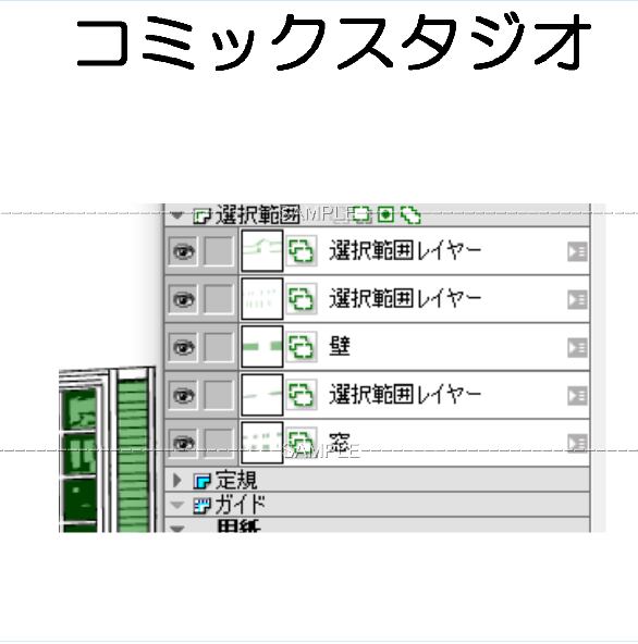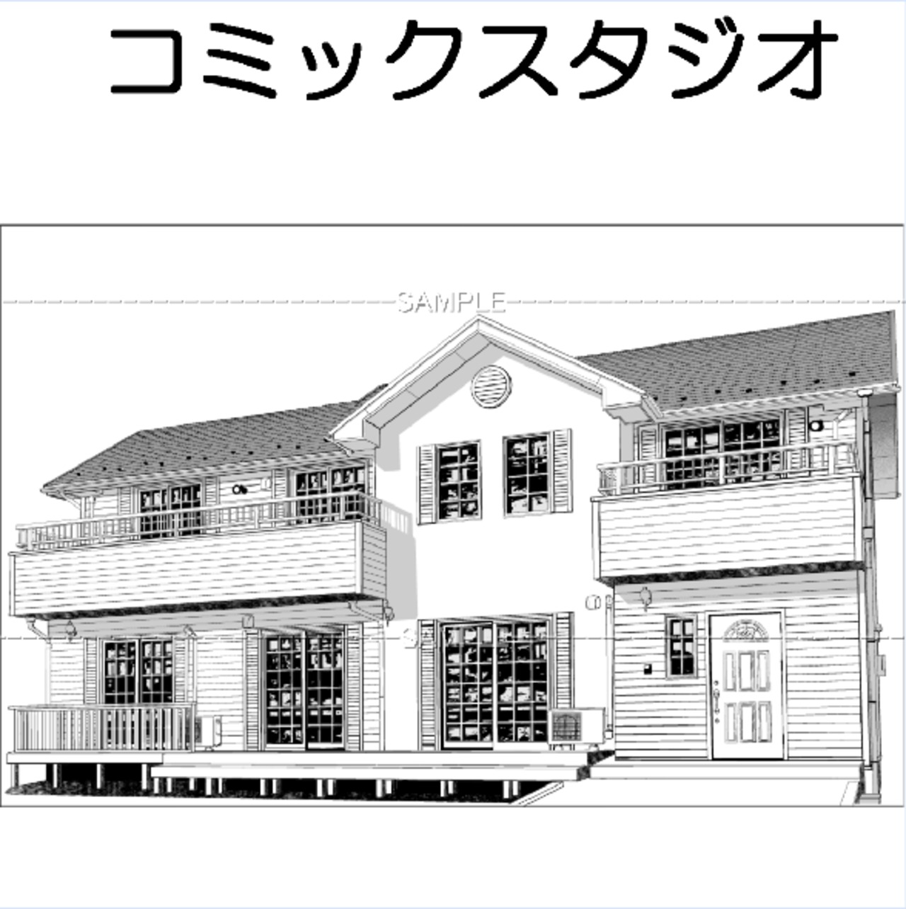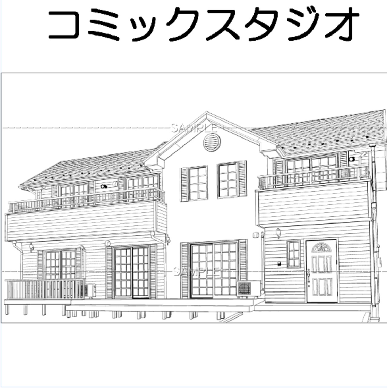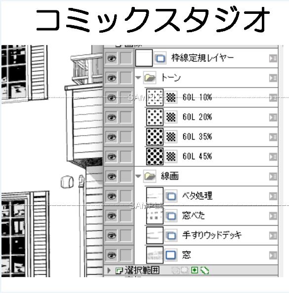 一戸建て住宅 コミスタファイル 選択レイヤー有 トーン選択・ベタ処理レイヤーのほか 手すりが別レイヤーになっているので 人物を入れたり加筆処理がしやすくなっています