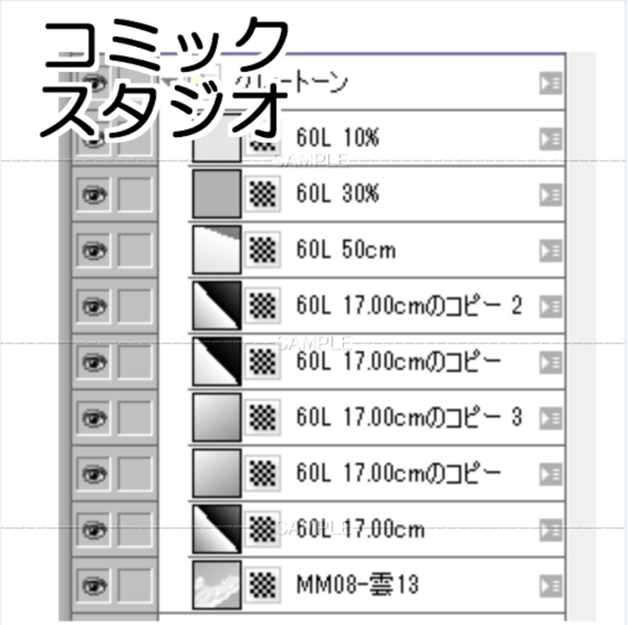高層ビル-002コミスタファイル トーンフォルダの トーンはグレー表示になっています ドット表示に戻すときは プロパティで変更してください 作画内容は各フォルダー レイヤーから確認できます