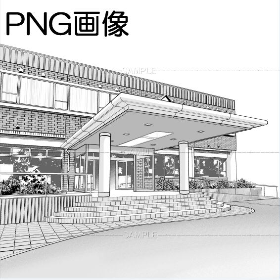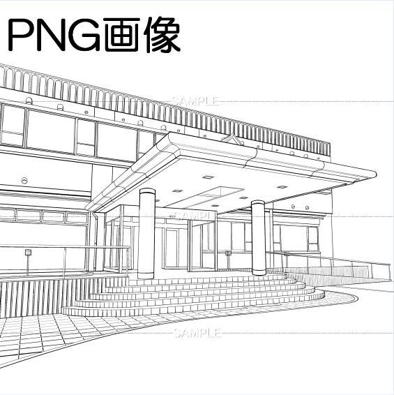sw建物外観03PNG画像 トーンベタ処理入り トーン無し 線画のみの3枚 原稿サイズ 5000×4447pixel 600dpi 公共施設 コミュニティセンター