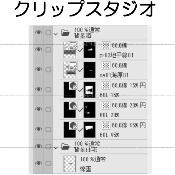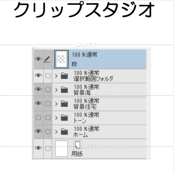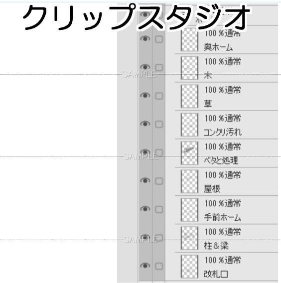 Aローカル駅-003クリスタファイル 選択範囲フォルダ有り ホーム先の海・住宅街は 別フォルダです 作画内容は画像の各フォルダー レイヤーから確認できます