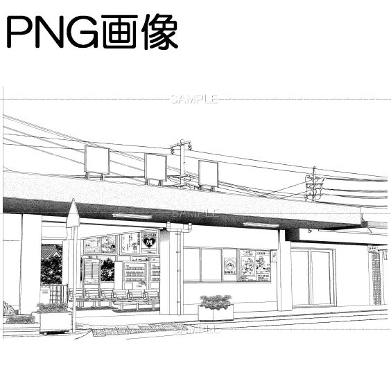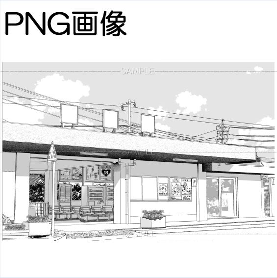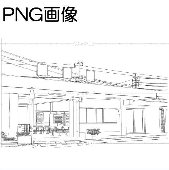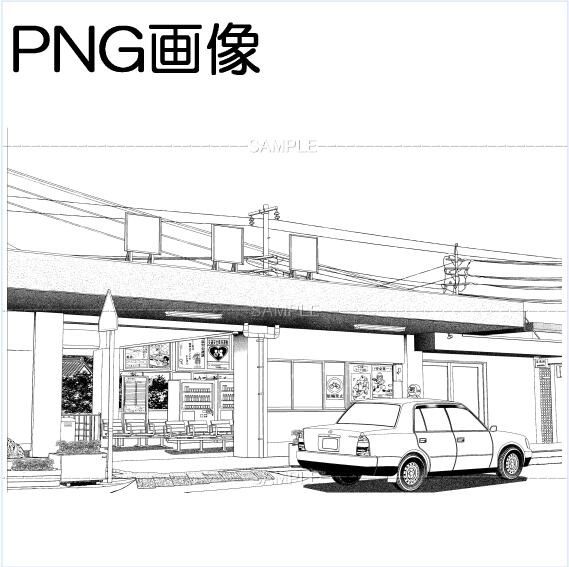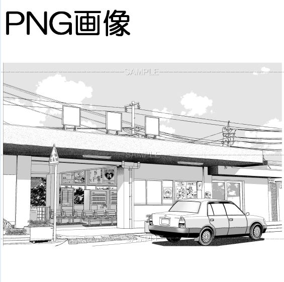 Aローカル駅-001PNG画像 トーンベタ処理入り トーン無し 線画のみ タクシー有り無しの5枚 画像内容はサンプル画面で 確認してください 原稿サイズ 5500×3618pixel 600dpi