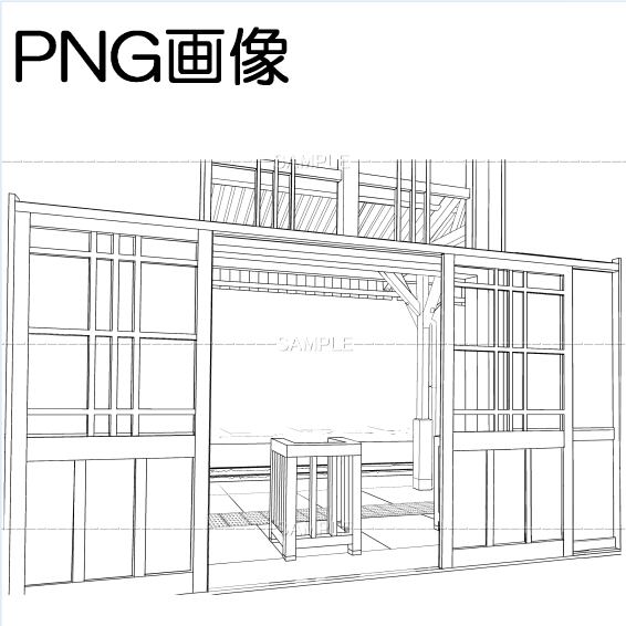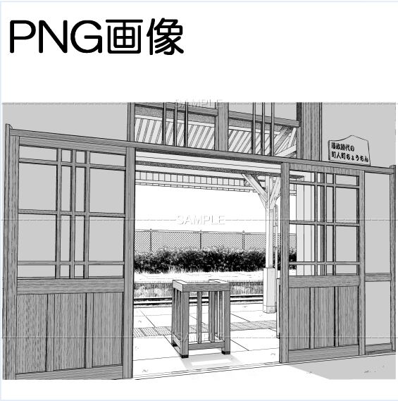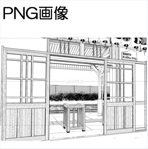 HG駅-02PNG画像 トーンベタ処理入り有り無し 提灯等備品有り無し 線画のみの5枚 画像内容はサンプル画面で 確認してください 原稿サイズ 5000×3527pixel 600dpi