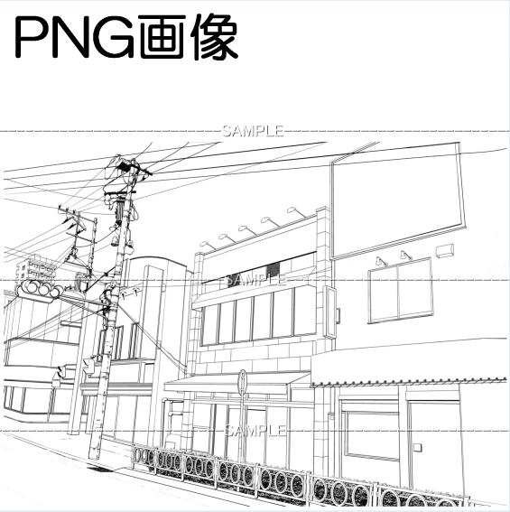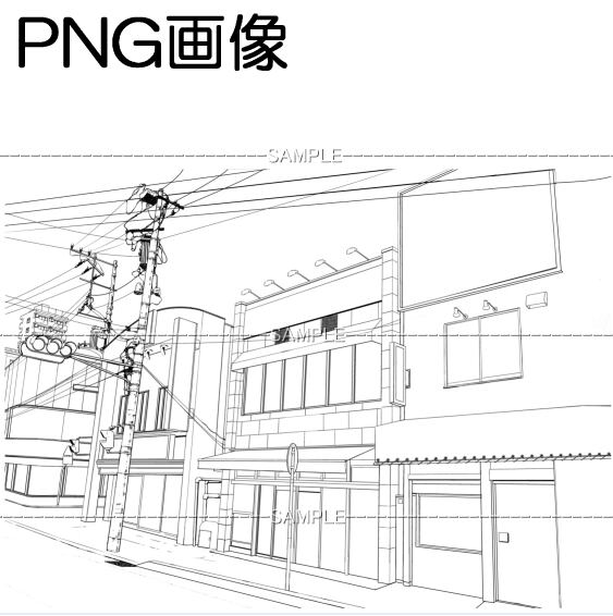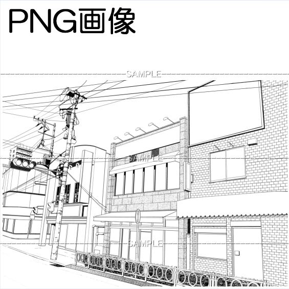町景-002PNG画像 トーンベタ処理入り トーン無し 植込みガードレール無し 線画のみの4枚 画像内容はサンプル画面で 確認してください 原稿サイズ 7000×5071pixel 600dpi